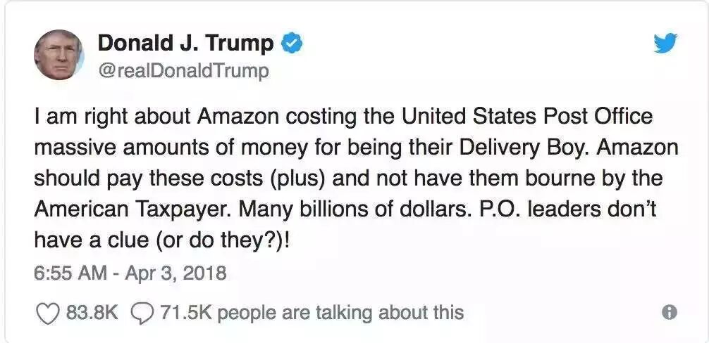 自当选以来,美国总统特朗普不断抨击亚马逊公司,指责这家公司“偷走”大量税款。一方面指责他们“逃税”,另一方面就是指责亚马逊公司“蹭补贴”。据说,美国邮政公司为亚马逊每发一单货,就要损失1.5美元。2017年亚马逊的出货量是13亿件,邮政公司一分钱没赚到,特朗普为此抱怨:“亚马逊把邮局当成快递小哥了。邮局每年要损失数十亿美元。” 特朗普抱怨亚马逊把美国邮政当成了快递小哥,为此造成数十亿美元损失 2017财年,美国邮政公司总收入是696.94亿美元,其成本是724.36亿美元,账面亏损27.42亿美元。然而,他们这一年从美国政府那里获得的各项收入,就超过180亿美元。此外这家国企还有融资借债,赤字高达500多亿美元。