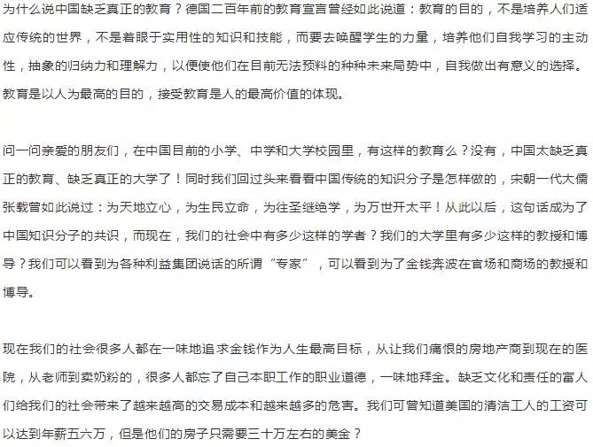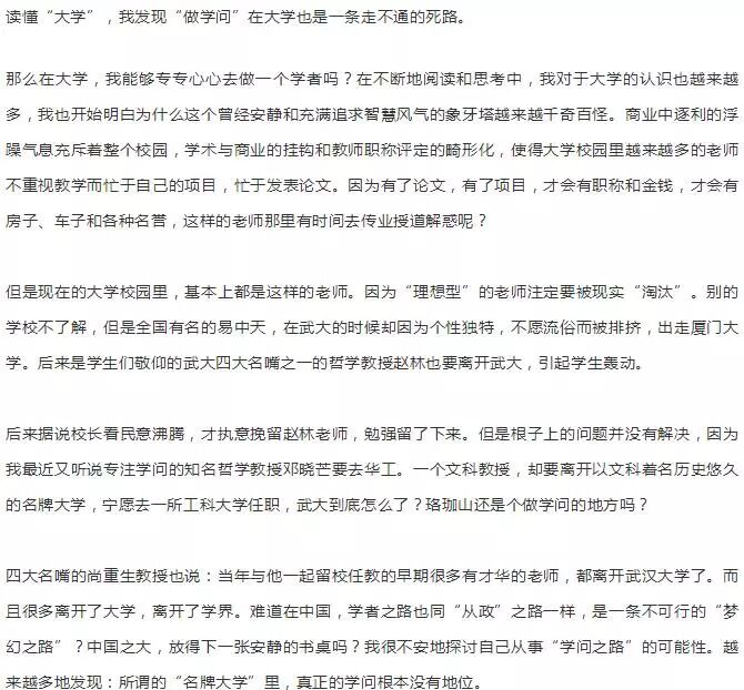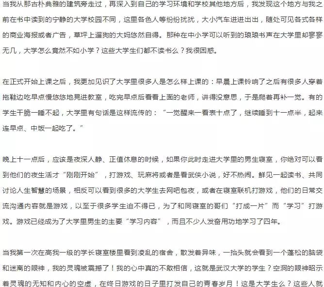 一篇萬言長帖《一名大學畢業生的反思》曾經備受關注。一時間對於教育質量的討論再次達到了一個高度。帖子如此之長恐怕會花費你的一些時間,但可以保證,真正將該帖完整讀完,你一定會為作者所寫的最真實,最露骨的大學所揪心不已。 五年多以前,我進入了全國重點名牌大學:武漢大學讀書。我抱着最理想的熱情,以為從此走上了一條報效祖國,報效父母的人生坦途,以為我的人生即將要大展宏圖! 一年半以前,我自以為已經看清了大學的本質,不願意再繼續自欺欺人地“學”下去,主動放棄了學校保研的名額,退出了用青春和熱血換取一紙毫無真實內容和分量文憑的遊戲,退出了虛偽可笑的“精英學歷社會”。 周圍的人都認為我瘋了,鬼迷心竅阿了。到底是我瘋了,還是這個社會瘋了? 精神缺乏、遊戲成風、學生忙着貼金、老師忙着項目――你認識這樣的大學麼? 是“為中華之崛起”而努力學習的新一代?我的內心裡有一個強烈的聲音告訴我:我絕對不要成為這個樣子! 我的一個同學,從大一到大四,四年的時間,除了考試和教室見個面,其他時間全部在寢室打遊戲或者看武俠,反正大學裡也沒有人管。後來因為掛科太多被學院勸退,家長過來求情延緩時間,但於事無補,遊戲照打不誤,直到大四時無法畢業。 另外一個同學,也是因為打遊戲掛科太多被勸退,母親來到學院跪在學院領導面前說:“我自己在家裡吃剩的菜葉在供他讀書,求你們給他一次機會吧!”當時我聽到學院領導講到這樣的事情的時候,我的內心很受震撼。父母吃菜葉供孩子在城市裡打遊戲,混日子?還要求情“給機會”?給他繼續遊戲的機會嗎? 都說可憐父母心,我想起我辛勤勞作的父母,我想起那千百萬把孩子送進大學的天下父母,他們都以為自己的子女在大學裡“努力學習”,辛苦地賺錢,無私地供養兒女“上學”,讓他們解除“後顧之憂”,不用擔心生活的問題。 殊不知如今大學校園裡,有多少人是在遊戲人生。用我在西安電子科技大學一位同學的話來說:“如果他的媽媽來在大學住一個星期,就一定會讓他退學回去”。因為在中國“上大學”,可能是人生中一段最輕鬆愉快的時光了。大家可以遊戲,看電視,逃課,武俠小說,這是很多大學男生的全部生活。 女生呢?看韓劇,不少女大學生的主要學習內容就是看韓劇等各種連續劇,感情劇,一部接着一部。你能想象這就是“我的大學”麼?很不幸的,這一切都是真實的,而且就發生在武大這樣的名牌重點大學裡。這些人考上大學的時候都是家裡的驕傲、很多同學眼羨的對象,可是為什麼他們在風華正茂的青春時代裡,行為如此令人費解?當時的自己不得而知。 當然,並不是所有的學生都這樣混日子,大學裡還是有很多人依然比較用功地學習,但是他們也一樣困惑:讓他們努力學習的原因主要是“恐懼”和壓力:怕找不到好工作,怕考不上研究生。 大家都聽說就業很困難,武大每年找不到工作的畢業生都很多,因此不敢“放縱”自己。但是很少有學生努力學習是因為追求智慧,追求真理,為國為民而學。這些用功的學生雖然沒有“遊戲人生”,但是卻生活在沉重的壓抑心理狀態下,思維往往呆滯,慢慢地走上一條被大學生們嘲笑的“越學越傻”的“傻博士”道路。 實際上,每年大學裡自殺的大學生,往往不是“不用功”的“壞學生”,而是這種心理嚴重壓抑,用功學習的“好學生”。他們一樣,從一進大學開始就碰到很多無法解決的困惑,同時被灌輸着一些所謂“正確的發展方向”,他們只是願意服從這些“權威結論”,以自我的壓抑而不是以心靈的呼喚來“學習”,這難道就真的比“玩遊戲”“看影碟”更好嗎?大學的學習到底是要達到什麼目的?大學生們為何都迷失了自己的理想。 照本宣科的老師一學期也見不到幾次,首先是專業的學習讓人迷惑:很多老師照本宣科,大學裡面真正關注教學、關心學生,有上課水平的老師越來越少了,不知道老師都在忙些什麼。 老師的本職工作應該是傳業授道解惑,可是有的老師一個學期學生也見不了幾次,派他的研究生來上課。後來我才明白原來他們都在忙着自己的項目和課題。大一的時候,我們通信工程專業有個博導帶物理,學生的評價是這樣:“還博導呢,都博成個啥了?講得稀里糊塗,還經常不來上課。”。大學選用的教材令人費解,明明有很好的全國通用教材,比如高等數學的同濟五版,卻偏偏要選用自己學校編的教材,艱難晦澀,連選用的習題都是歷年研究生考試的數一類,可能是編排教材的老師想提前讓我們進行考研準備吧? 後來才知道學校選用這種“自編教材”的原因,是老師們因為要“評職稱”。需要“科研成果”,就東拼西湊的亂編一些“教材”來“完成任務”,這种放到書店裡根本沒有人會要的垃圾教材,他們就利用自己教學的權利,發給大學生們上課用。 據說老師們也很可憐,每年都要完成所謂的“科研成果”,要寫論文,出書來完成任務,否則就可能降職。有些老師沒辦法就自己花錢在外面找刊物發表文章,這種可以不花錢出教材,讓學生買單的事情也很容易理解了。 大學裡的學生生涯,除了要求學生的專業學習之外,鮮有啟迪心靈的聲音,更重要的是缺乏指導大學生人生發展與定位的課程,能夠讓大學生明白自己為什麼學,為什麼活的課程。我自己學習的專業是電子信息科學類,和很多同學一樣,我在必修的公選課如高