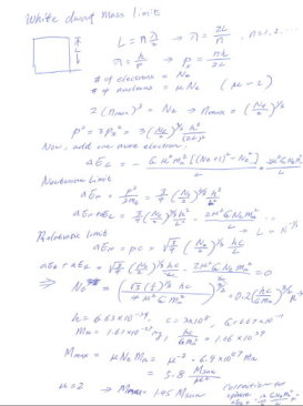 进一步考虑狭义相对论,科学家发现,如果白矮星质量超过一个极限,那么电子的压力也无法抵抗引力,白矮星会进一步收缩。这个收缩过程中会产生大量的热量,导致星体内部温度急剧升高,而引起碳、氧等元素进一步聚变,整个星体在极端的时间内爆炸。这就是Type Ia超新星。所有重元素,都是超新星爆发种产生的。人体里的那些重元素实际上都是超新星的遗迹。 一般白矮星刚形成的时候,质量低于这个称为钱德拉塞卡极限的数值,但是随后白矮星可能吸附星际物质,质量不断增加,一旦达到钱德拉塞卡极限,就会走上超新星爆发的不归之路。 下面我来计算一下白矮星的质量极限。为简单起见,我们用一个边长为L的立方盒子代替球状的星球。然后,我们往这个立方体里加入N个电子以及与之相应的质子与中子。这N个电子会产生压力,而质子、中子则是星体的质量的主要部分,产生引力。 量子理论告诉我们,所有的物体同时又是一种波,其波长a为普朗克常数h除以物体的动量p。换言之,物体的动量 因此, 现在,我们考虑往这个盒子里再增加一个电子与两个核子。一方面,这个电子会被放比(K,K,K)高一点点的能级上,这个能级对应的动量与N^1/3成正比,与L成反比。另一方面,增加的核子导致引力负能的增加。这个引力负能与星体的质量、也就与N成正比,与星体的大小L成反比。 如果电子速度远低于光速,根据牛顿力学,其动能E_k与动量的平方成正比,也就与N^2/3成正比,与L的平方成反比。因此,我们总可以通过减小L,让新增的动能与引力负能抵消。具体而言,L ~ N^(-1/3)。也就是说,星体质量越大,半径越小。 但是如果N足够大,电子的速度接近光速,那么其动能就近似等于动量乘以光速, E_k= p*c。因此,在相对论极限下,这个新增动能量与L成反比,与N^1/3成正比。而新增引力负能是与L成反比,与N成正比。其结果是,如果N大到一个数值,增加物质将导致星体的总机械能降低,而半径缩小再也无法扭转这个局面。其结果是,星体将走上继续收缩的不归路。用这个盒子模型,我得出星体的极限质量是 如前所述,在这个收缩过程中,引力能将被转化为热能,导致星体内的碳、氧元素进一步聚变。大约经过1000年的酝酿,一颗超新星就爆发了。