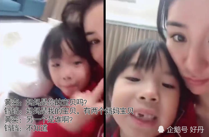 不過在視頻中,卻出現了這樣一段對話,黃奕問鐺鐺,媽媽是你的寶貝嗎?鐺鐺回答,媽媽是我的寶貝,有兩個媽媽。黃奕再問:另外一個是誰啊?鐺鐺:不知道。