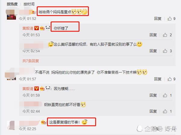 有網友評論:“我聽到鐺鐺說有兩個媽媽”,黃毅清則回應:你聽錯了。不過大部分網友都認為這是要復婚的節奏。
