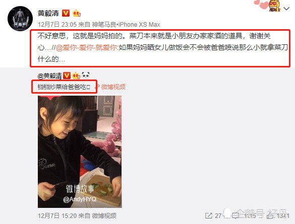 而在另外一段視頻中,黃毅清上傳鐺鐺炒菜視頻,還特意轉發解釋說,是黃奕拍的。