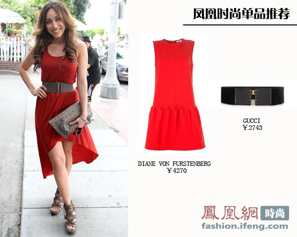 純正的復古不規則下擺小紅裙,修身的剪裁塑造出完美的身段,搭配一根寬腰帶,更出彩,精緻的鉚釘手拿包,豐富細節,更加惹眼,加上輕盈的裙襬,盡顯優雅淑女味兒。