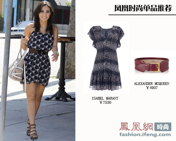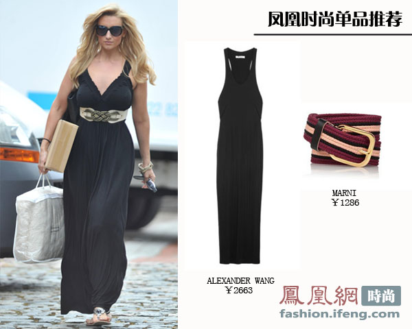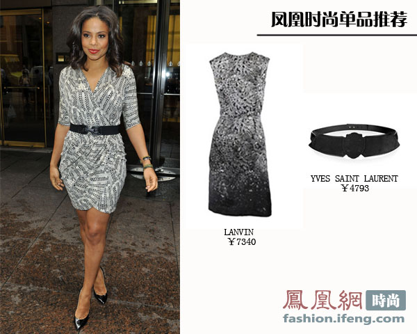 幾何圖案連衣裙是很難搭配的,因為穿不好就會給人視覺上帶來亂亂的感覺。桑娜搭配的黑色寬腰帶,巧妙分割黃金比例,既讓人覺得連衣裙非常合身,又穿出了好身材,並擁有小蠻腰。
