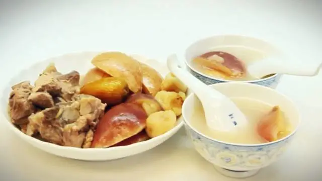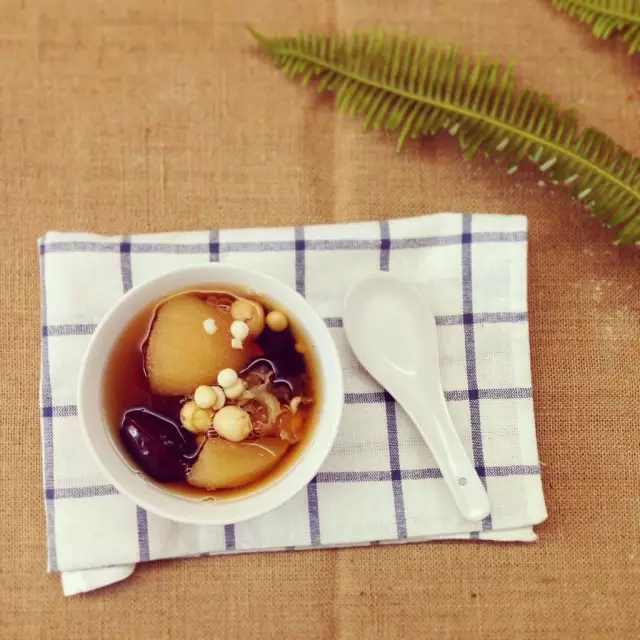 3. 鍋中加水、梨、紅棗(去核,不容易上火)、杏仁、紅糖、銀耳,水煮開;攪拌後,再繼續煮約45分鐘。