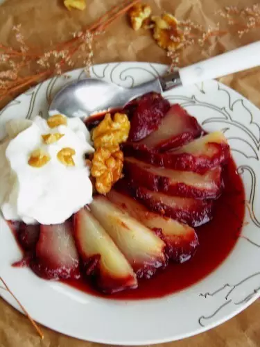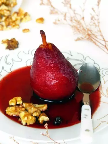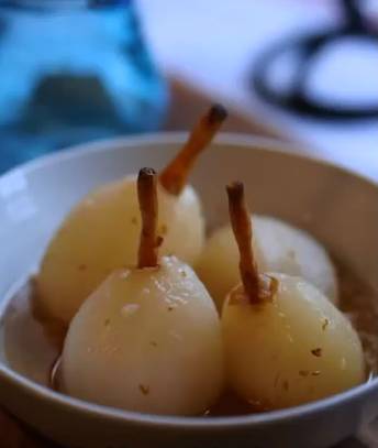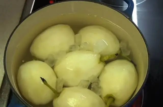 2. 梨削皮,放入鍋中,翻動梨,確保梨均勻吸收紅酒,煮30-40分鐘。
