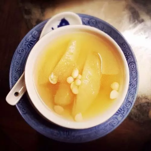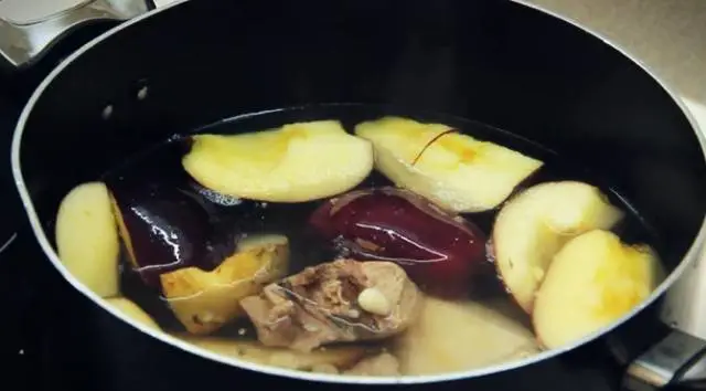 3. 大火,鍋加水、豬骨、無花果、蘋果、雪梨、杏仁,煮沸騰,轉中火,繼續燉煮1.5小時,放鹽調味即可。