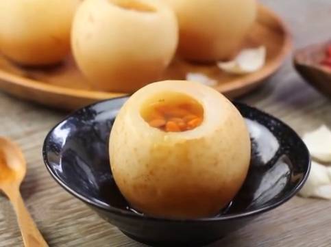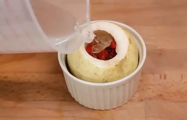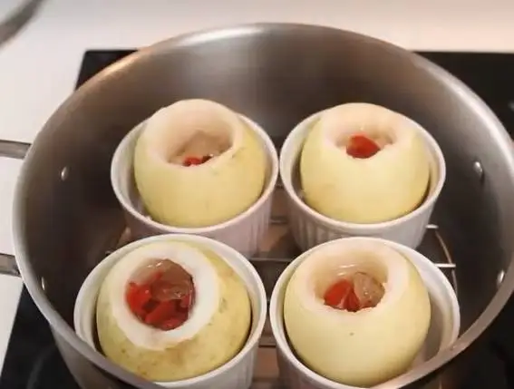 2. 將雪梨放入碗中,往雪梨內塞入百合、枸杞、冰糖,再倒入水(不要加滿)。
