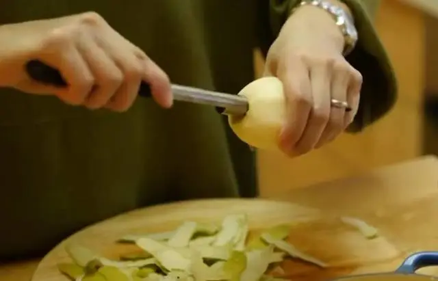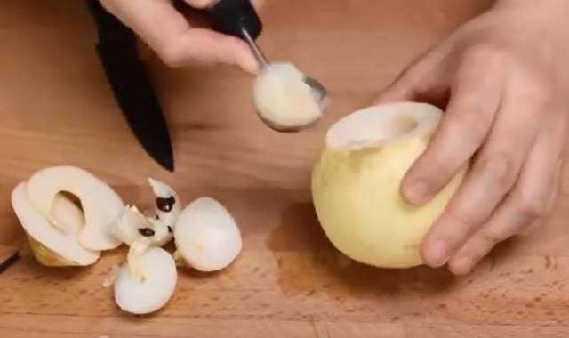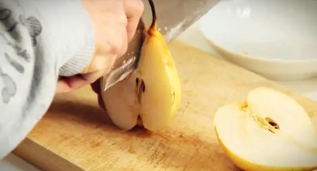 2. 豎切雪梨,去除果核,蘋果同雪梨一樣處理即可。