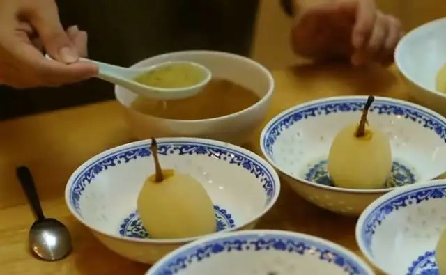 3. 大火燒糖水,收汁,約10分鐘。碗中加干桂花,糖水過篩,澆在桂花上。將桂花糖水澆在梨上即可。