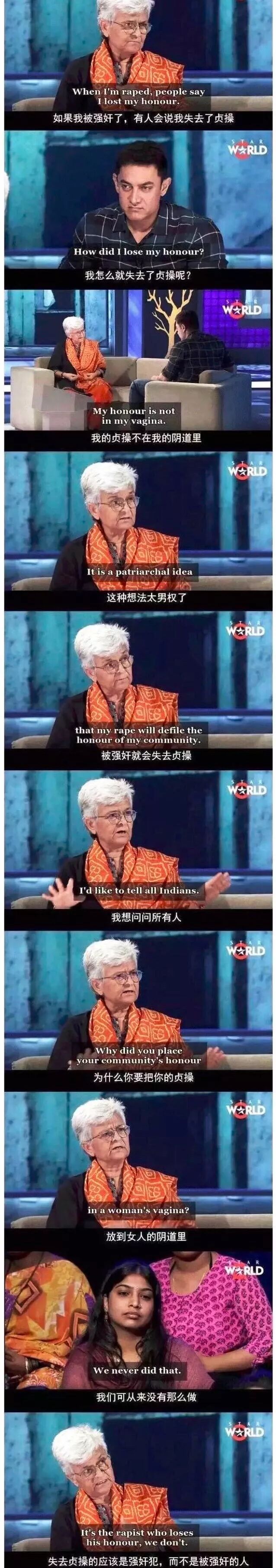 “如果我被强奸了,有人会说我失去了贞操。我怎么就失去了贞操呢?我的贞操不在我的阴道里,这种想法太男权了,被强奸就会失去贞操。我想问问所有人,为什么你要把你的贞操,放在女人的阴道里。我们可从来没有那么做,失去贞操的应该是强奸犯,而不是被强奸的人。”