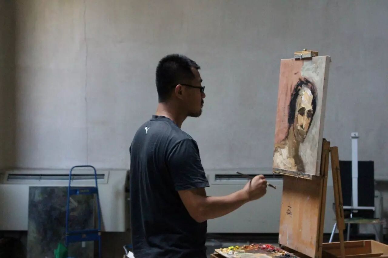 那天是5月24日,我走進了中國油畫院的一個畫室,胡昌煢、謝宜君和韓博博三人正在擺模特。模特扶着個鐵杴站着,一絲不掛,他們三人圍着模特轉圈走,步子很慢,眼睛緊緊地盯着模特,神情特別嚴肅,看起來像一個宗教儀式。走着走着,胡昌煢和謝宜均站住了,胡昌煢向前方伸出了一隻手,就像大軍的統帥很淡定地指揮什麼的,謝宜均則聚精會神沿着胡手指的方向望去。