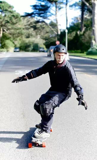 78歲的滑板手Lloyd Khan,在65歲時才第一次踩上滑板,立馬就摔了下來,弄傷了手。即便如此,他內心知道自己找到了愛好所在,從那時開始練習滑板一直到今天,不過他的防護裝備很齊全。他說:“我不會玩什麼花樣,不像那些十幾歲的人的滑得那麼快。”