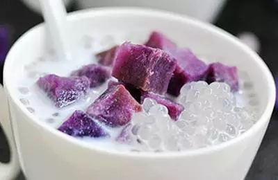 食材: 牛奶&椰汁1:1、西米150克、紫薯2個 步驟: 1、鍋里加水,水開後放入西米煮,大火煮開後轉中小火,一邊煮,一邊攪。煮至西米中間有個小白點時關火燜至完全透明狀;將紫薯去皮切片入蒸鍋蒸熟。 2、煮好的西米撈出過涼水;蒸熟的紫薯切丁。 3、鍋洗淨,倒入椰汁和純牛奶,混合均勻,加熱至八十度後倒入杯中,把煮好的西米放入椰汁牛奶中,再放入紫薯丁即可。 |
