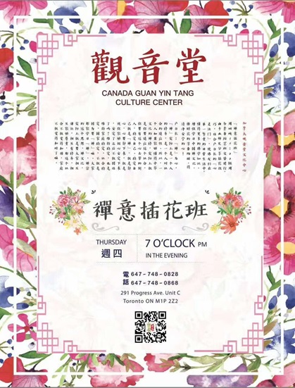 插花,是一种艺术手法,以植物枝叶、果实以及花朵插进容器内来作为装饰的一种装置艺术。它的历史极为悠久…… 加拿大观音堂文化中心禅意插花班周四晚19:00隔周与素香厨艺班交替进行,由专业师兄分享插花技巧,使佛友们在单一繁重的日常生活中,懂得更多的佛学知识,增强学习中国禅文化,借鲜花的芳香绚丽,得清净安宁的心! 费用: 免费 时间: 每周四晚7:00pm (隔周与【素香厨艺班】交替进行) 地址:291 Progress Ave. Unit C, Toronto, ON M1P 2Z2 电话: 647-748-0828 / 647-748-0868 Email: guanyintangca@gmail.com