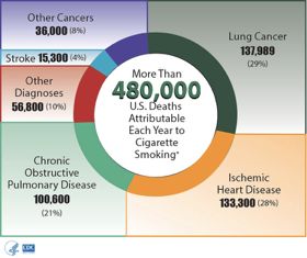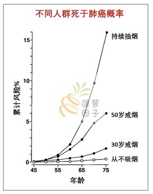 戒煙很難,但所有得肺癌的人,都成功戒了。 可惜,這時通常已經太晚了。 (二) 如果不怕16%~25%的肺癌概率,是不是就隨便抽煙呢? 當然不是! 因為肺癌只是吸煙導致人死亡的一小部分原因。 美國研究發現,吸煙致死原因里,只有不到1/3是由於肺癌,和肺癌同樣高比例的,還有心血管疾病,包括缺血性心臟病,中風等,除此之外還有肺部疾病,尤其是慢性阻塞性肺病(COPD)。 粗略換算一下。 剛才說吸煙多的人,有25%概率死於吸煙導致的肺癌。按照這個比例,這些人會有28%概率死於心血管疾病,18%概率死於肺部疾病, 7%死於吸煙導致的其它癌症,9%死於吸煙導致的其它疾病。 加起來,25+28+18+7+9=87%! 香煙被譽為"人類有史以來殺人最多的毒品",並非浪得虛名。 這是75歲的概率,再早點,比如65歲呢? 查查數據就知道,煙民有35%的概率,在65歲會死於吸煙帶來的各種疾病。也就是說,雖然現在人均壽命已經接近80歲,但一輩子抽煙的人,1/3活不過65歲。 吸煙讓人平均少活12年!資深煙民幫社會節約了大量醫保,也算是活雷鋒了。 記住: 1:抽一輩子煙,不得肺癌的幸運者很多,但能不死在它手上的人很少! 2:所有得肺癌的人都戒煙成功了,但你不用等到那一天! 來源: 菠蘿 牛不耕 2018.05.31 |
