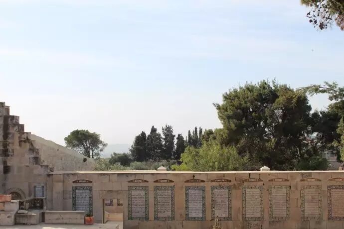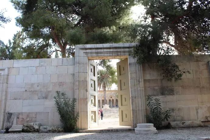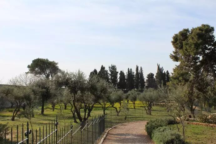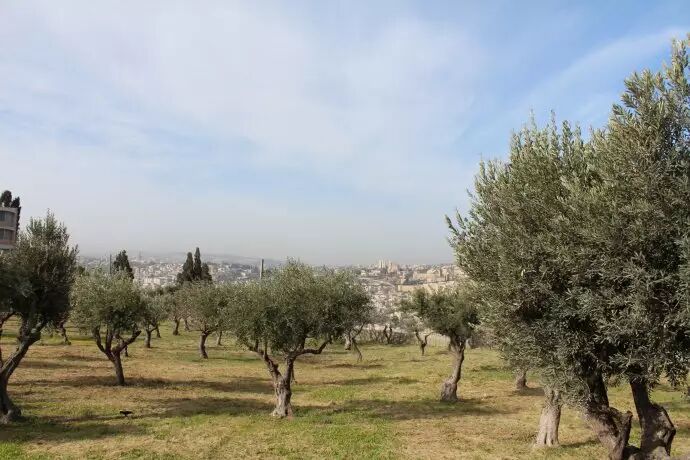 我們是用普通話背誦的,我還聽到了其他國家的兄弟姐妹也用自己的鄉音背誦主禱文,很美,雖然我聽不懂他們的語言,但最後一句,和我們的發音一樣:“阿門。” 我又走回了教堂的院子裡,走了一會兒,發現了一個小旁門,進去,原來是一個小園林,裡面,一棵棵橄欖樹生意盎然,地表上,一層鵝黃色的小花,前面,耶路撒冷古城巍峨,靜穆,回首,主禱文堂尖頂的十字架指向高天,長天藍色輕柔,白色也輕柔。