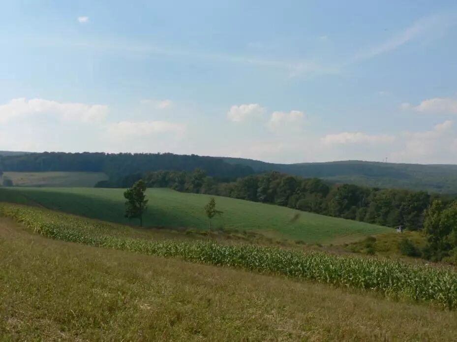 就这样我们走上了山头,山头的这一边是绿树,那一边是玉米地、大豆地,还有大片的地被收割过了,只留下了庄稼的茬子。看了一会儿后,顺着山坡,我们往下走,脚踩在庄稼茬子上,咔咔地响,锋利一点野草,把腿划疼了,但乡间太美,把我的心思拴住了。