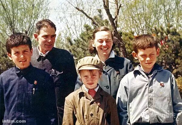 1967年,北京,瞧,这美国一家子在中国的岁月。阳和平(前左),阳及平(前中),阳建平(前右),阳早(后左),寒春(后右) (阳和平/图)