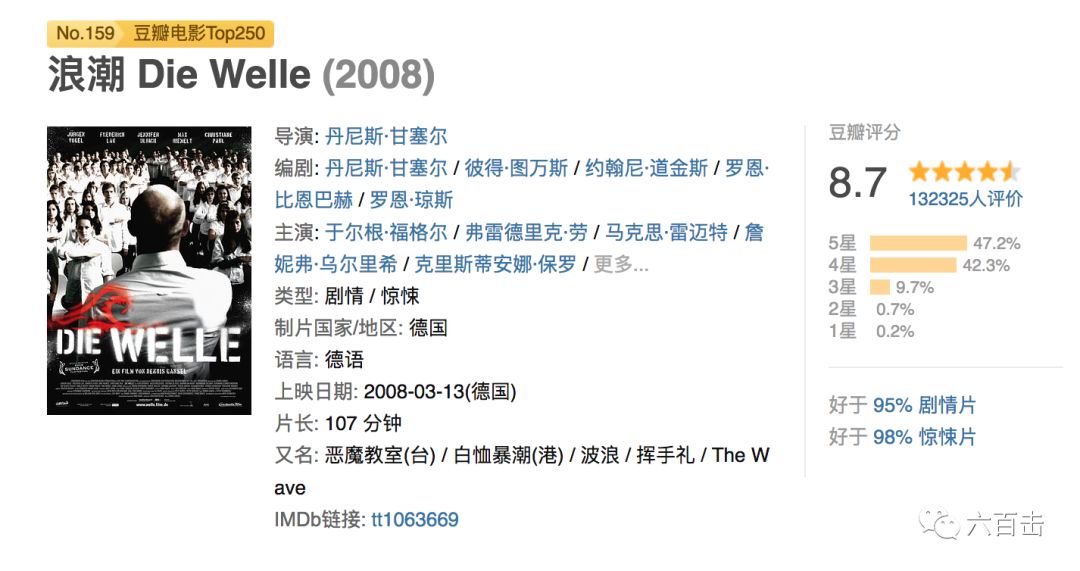 罗恩.琼斯不知如何回答,所以他进行了一场大胆的实验。 他要重构纳粹德国,让学生亲身体验法西斯主义。 没想到,在民主教育非常普及的美国,罗恩.琼斯只用了五天的时间就复活了纳粹。 甚至实验发展到最后,局面已经无法控制,学生们无比狂热、告密成风,实验最终不得不终止。 那么,这五天到底发生了什么?独裁是如何炼成的? 由这场实验改编的高分电影《浪潮》会给你一个后背发凉的答案。