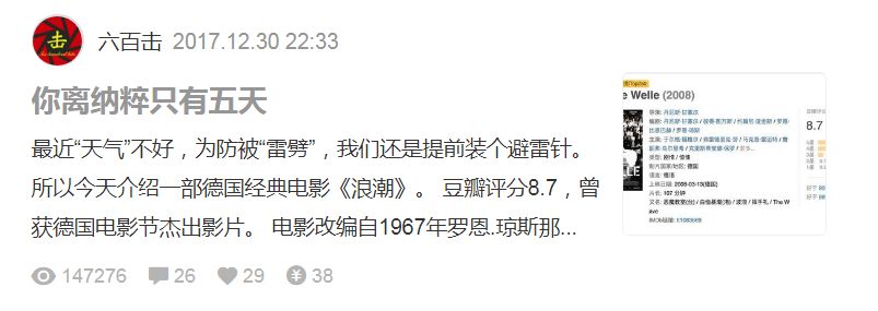在高纪律性、高权威性的浪潮面前,个体的理性和良知一定会让位于集体的意志。 更可怕的是,独裁会把独裁者的欲望无限放大。 文格尔只是享受了五天的“元首”生活,就已经不知不觉地迷恋上了万众崇拜的感觉。 这是多么的可怕。 而要避免浪潮出现,我们一定要肯定个体的神圣权利,要善待异见者,要聆听不同的声音,要有监督和权利制衡去规避独裁的产生。 面对权威发出的不正当要求,我们更应当忠于良心和真理。 否则,我们永无自由,而浪潮的悲剧也会重演。 六百击 2018-05-08 |