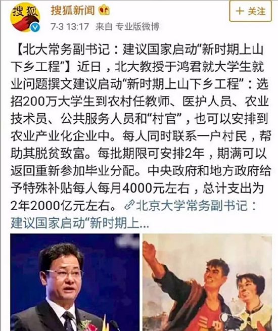 北京大学党委常务副书记、马克思主义学院院长、博导于鸿君教授建议国家启动“新时期上山下乡工程”,解决目前大学生严峻的就业问题。这位把儿子送到澳大利亚深造、把女儿送到波士顿进修的省部级高知,却忽悠国人把刚毕业的孩子送农村去扶贫!