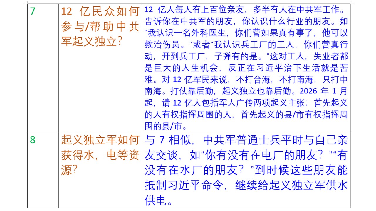 中共军起义独立探讨一:张又侠,刘振立吹响了习近平下台的冲锋号。2026年1月18日张又侠意图在京西宾馆抓捕习近平。不料行动前两小时,习近平获得消息,撤离了京西宾馆。张又侠的卫队与习近平的卫队在京西宾馆发生枪战。1月24日中共国防部宣布张又侠,刘振立违纪违法被调查。据悉同时习近平要求13个集团军的司令,5个战区的司令,8个军兵种的司令表示支持习的行动,到2月8日,15天过去了,26个司令中,没有哪个司令表示支持习。这在以往是不可想象的。用中共的话讲,习近平是凌驾于全党,全国人民之上。 中共军起义独立探讨二:中共军少将,中将,上将从2026年1月起实行塔山战役模式,将军全部到部队,现在的旅里去,家属也带到旅里去。塔山战役模式见中共电影《大决战》之《辽沈战役》。2000年以来,中共军的军部,战区司令部,八一大楼都是知识分子成堆的地方。打字的手能打枪吗?习近平掌握了警察,特勤局,随时能来军区大楼抓中共军将军。所以中共军将军只有到旅里面工作,生活,才能有安全。旅有围墙,岗哨,习的特警也进不来。习的特警来估计也就30支步枪或手枪,一个旅4000人配备有步枪,机枪,火箭筒,完全可以把习的特警消灭掉。中共将军,别人都来抓你了,你还要手软吗?将军可以自己选择自己的办公,生活地点。至于军部,战区司令部的知识分子让他们继续在那里做数学题,化学题。题做好了,用电子邮件发给在旅里的将军。为了引起中共军将军的重视,我们民主人士把这叫民主人士给中共军将军的一号令:少将,中将,上将从2026年1月起本人及家属下到旅里,实行塔山战役模式。 中共军起义独立探讨三:中共军起义独立的动力:士兵不再是奴隶。中共军实行奴化管理,不给士兵自由,隐私。实行一系列折磨人的制度,包括杯子,牙膏,肥皂盒等要拍成一条线,被子要叠成豆腐块,等内务管理。士兵怎么走路都管,包括齐步走,队列训练,一个连所有必须在同一秒迈左腿,同一秒迈右腿。士兵去哪里都要向班长报告。士兵四人,五人住一个房间,床除了晚上睡觉,白天不能坐,不能躺。手机随时被查看,收走。下午5点后,中共军还必须看晚上7点的《新闻联播》,还有晚上9点的晚点名。传说中的奴隶制也没有这么残酷。中共军起义独立后,无论是多少人,都废除掉这些侵犯人权的制度,杯子,牙膏,手机本来就是私人物品,长官无权过问。士兵住宿上下铺取消,可以用墙板,分割大房间,安门,安锁,不是高科技,做到士兵一人一间卧室。军人与其它行业一样,有人权,有隐私,有纪律。作息时间上午6点半出操,下午5点下班。晚上值班的就是白天休息。 中共军起义独立探讨四:起义独立的一个营,一个旅如何获得弹药,油料。中共军按旅为单位驻军,一个旅有一个弹药库。习近平最怕中共军起义或造反,所以中共军需要的弹药,油料,食材,医疗都是后勤保障部队管理。也就是旅里自己是没有弹药的。在2020年代,习近平搞得天怒人怨的情况下,中共军一个普通士兵也能发挥巨大作用。比如步兵营士兵A与保障部队士兵B是朋友,那就可以说了。平时各种制度约束,谁也难开绿灯。但真到了起义独立那天,那真不同了。在习近平治下,生活基本上是痛苦,难有快乐。不起义独立,那就是任人宰割。营里可能有少量弹药,指战员每人平时收集几发子弹也是可能的。一个弹药库平时也就保障部队几十人把守,如果强攻,几百发子弹就能攻下来。一个营,一个连获得油料的办法类似。看守弹药,油料的都来自普通百姓,谁不厌恶习近平?起义独立部队从保障部队获得食材,医疗的难度应该更小。 中共军起义独立探讨五:起义独立军如何获得钱。中共军在1990年代,2000年代比禁止经商,到2020年代没有财源了。中共起义独立后,钱从哪里来?习近平政权不可能再给起义军钱。人民币是中国人民银行发行,人民币印刷厂只听中国人民银行的命令印多少钱。金融体系掌握在习近平手里。起义独立军,无论是一个营,一个旅,一个集团军要想再获得人民币都不现实。那就自己印刷货币,叫华元,什么元都可以。印刷货币主要是防伪,别人不能伪造。大约是三台印刷机。第一台印刷机印刷几种防伪标志,包括水印。第二台印刷机印刷钞票图案。第三台印刷机印刷钞票的数字和编号。中共军在1920年代就能自己印钱,现在2020年代,100年过去了,起义独立军也可以自己印钱。 中共军起义独立探讨六:起义军是就地独立,还是打向北京?一个县独立了,也要通电全球,说清楚,习近平不派兵来打起义独立军,起义独立军也不打北京,就呆在原地。如果习近平派兵来打起义军,那起义军如果在本县打败了习家军,就可能打向北京。我们民主人士的建议是就地独立,在一个县,或几个县,如陕南,皖北独立,而不是打向北京。我是在军队工作过几年了,在美军第一步兵师工作了三年。部队到另一个地方去有士兵住宿,油料,交通等大问题。起义独立后,士兵在营房里有单间住,到另一个地方住大帐篷,就是几十人一个房间了,帐篷有没有暖气,难啊。铁路,机场都掌握在习近平手里,火车司机,民航飞行员按体制不能运送起义军。这里涉及我们谈的下一个问题,12亿民众如何参与起义独立或帮助中共军起义独立? 中共军起义独立探讨七:12亿民众如何参加/帮助中共军起义独立。武器面前人人平等。不要再想着中共的官阶了。中共环境的农人,工人,失业人,家庭主妇完全