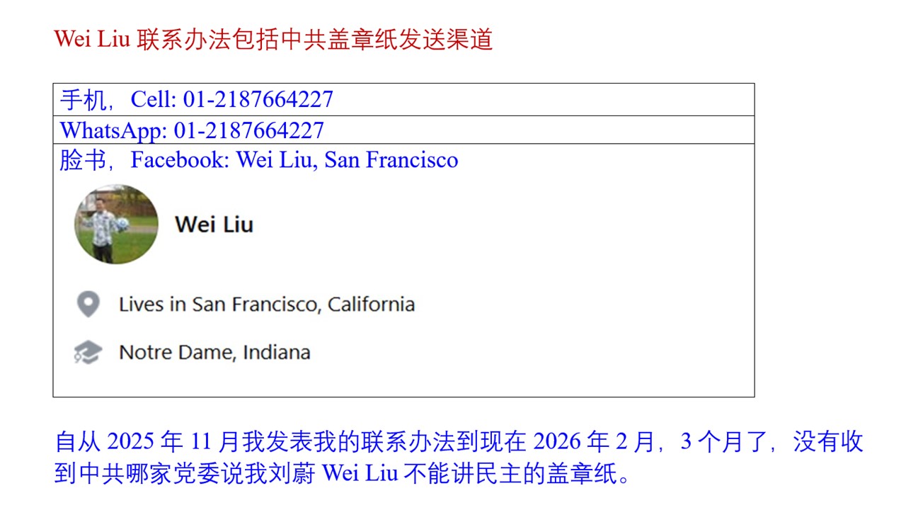 本集主要内容: Main Idea of this Episode: 我从2000年代讲民主到现在2020年代,已经是讲民主第三个十年了,没有收到中共说我不能讲民主的盖章纸。自从我2025年11月发表我的联系办法及法制必须有盖章纸以来,到现在2026年2月,3个月了,没有收到中共哪家党委说我刘蔚Wei Liu不能讲民主的盖章纸。 本月我们我们主要就谈一个事情,中共军或中国军民起义独立的十大探讨。本文有我联络办法,没有收到中共说我不能讲盖章纸的图片,中国军民起义独立列表如下。