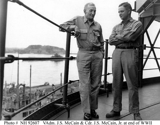(1945年,麥凱恩一世和麥凱恩二世在東京灣) 麥凱恩三世沒當成將軍,退休時只是上校,因為越戰時被北越人擊落了當了俘虜,沒趕上晉升。因為他是海軍司令的兒子,所以這事弄得很大。連被俘的時候都留了照片下來: