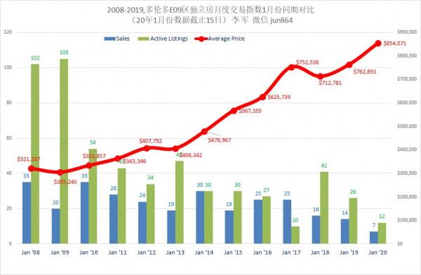 | 2008-2019, 士嘉宝独立房1月份交易指数同期对比(所有区域均价都超过80万) |