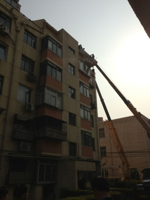 另人遗憾的是,城管和什么网格监管办再没有跟老爷子废话,就在当天下午(4月20日周六)直接找来了两辆大吊车,找来了一帮穿制服和没穿制服的人,拉起警戒线,直接让几个民工坐吊车爬上六楼,翻入窗子,开始强拆。