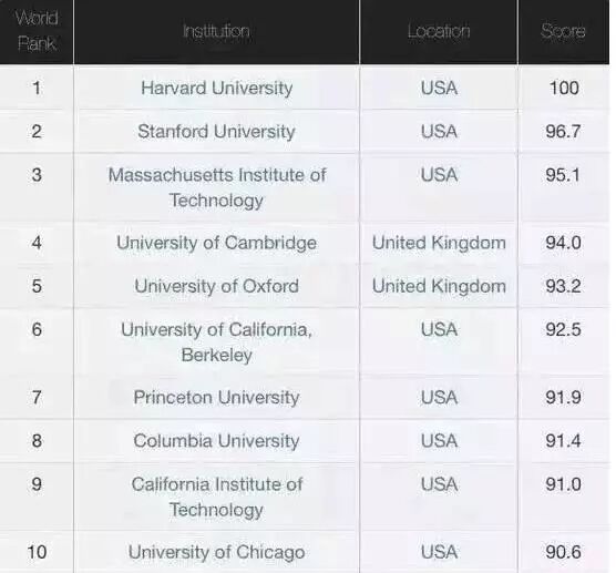 而且在前10的名單中美國就占了8個,其中英國的劍橋大學和牛津實力當地,打消了美國獨占紅榜的念頭。