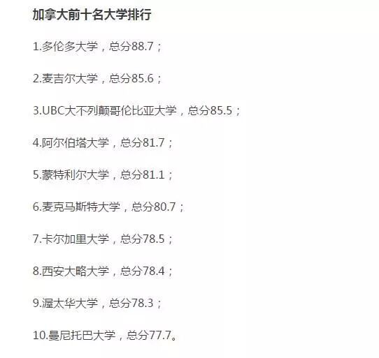 在加拿大的眾多大學中,第一名多倫多大學以88.7總分的成績,進入了世界大學排行榜的前40名,後面的大學也不甘落後,排名的情況也是非常不錯的。