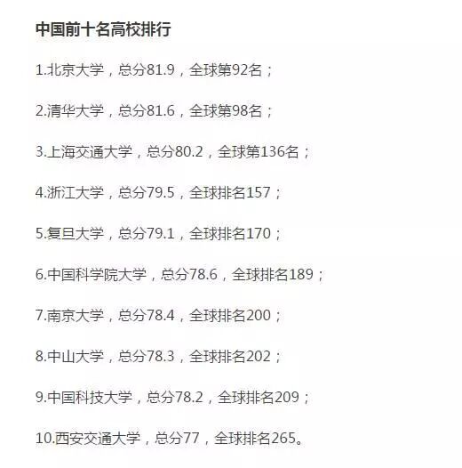 可以看到中國前10名的高校,在世界大學排名中層次不一,懸殊有點大。清華大學總分為81.9,位居92名,北京大學81.6位居98名,可見大學之間的競爭是非常激烈的。不過就看總分而言,和其它世界級優秀的大學也差不到哪裡去,在世界實力還是非常的高的。