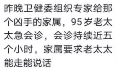 杨文医生死后,罪犯家人,也就是那个95岁老太太,立即被升级成超级vvip待遇,领导火速组织全市顶级专家紧急会诊,全力以赴免费救治,积极安抚家属情绪。