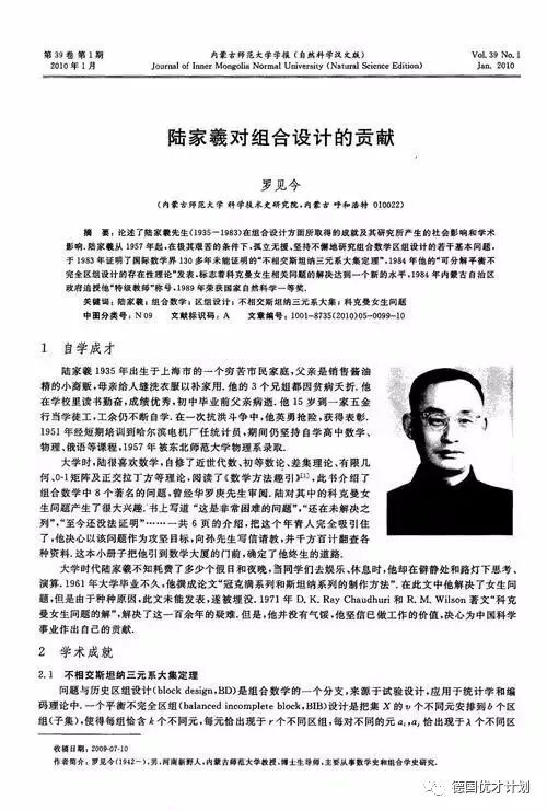 他死了,是被活活累死的, 世界知道他, 可中国却不知道他。 他死了,是被硬生生冻死的, 因为他的周遭, 实在太冷、太冷...... 临终前,这个中学教师留下一道难题, 让整个中国都沉默了。 他,就是陆家羲。 1935年6月10日, 他出生在上海一个贫苦家庭, 从小成绩优异,尤其对数学情有独钟。 从东北师范大学物理系毕业后, 他以专业第一名的成绩, 被分配到包头钢铁学院任教。 而无意中买到的一本《数学趣引》 改变了他的一生。 书中记载了“寇克曼女生问题”, 它是100多年来, 世界无人能解的数学难题之一。 他被这道题深深地吸引住了, 废寝忘食,埋头钻研, 终于,他竟基本破解出了, “寇克曼女生问题”! 这实在是令人惊叹的天才大脑! 但谁能料到, 他即将会遭遇那么多的不幸…… 1961年,他把论文: 《寇克曼系列和斯坦纳系列制作方法》 寄给中国科学院数学研究所。 一年过去了, 对方回信“可以投稿” 没有肯定,没有建议, 就这样将他的成果搁置一边。 他苦笑,只继续埋头完善论文。 1963年, 他再次把修改过的论文, 又投寄给《中国数学通报》。 又是一年的等待, 而回信只有草率的一句: 建议改投其他刊物。 1965年冬, 他把“寇克曼系列”推广到四元组, 投给《数学学报》。 又等了一年, 退稿信写着:没价值! 三次投稿,三次被退, 他耗费多年心血的研究成果, 一次次被忽视、一次次被搁浅。 他没等来世界数学的宝座, 却等来了一场10年浩劫—— “文化大革命”开始了。