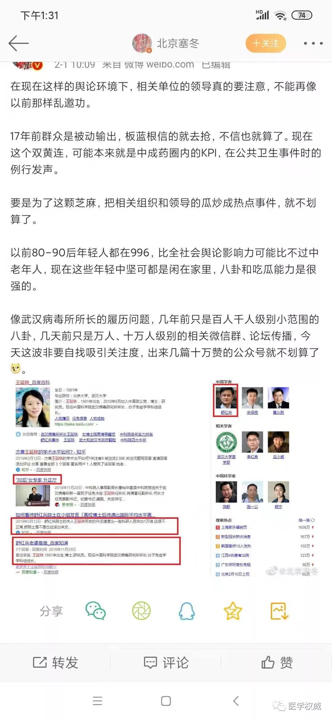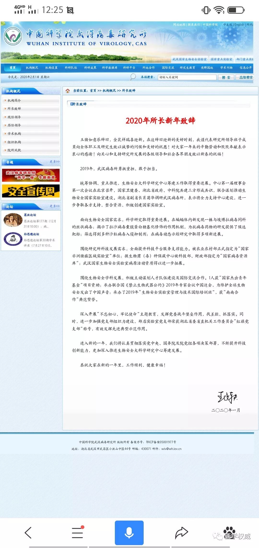海外专家首先开始发炮: 病毒是从哪里来的呢 武汉病毒所所长你有难了。老公是武汉大学副校长舒院士(1967年)。王延轶38岁任正厅级中科院武汉病毒所所长(1981年)。说!你们是真爱吗? 武汉病毒所和上海药物所共同发现双黄连能治病毒,能经得起历史检验吗? 小编注:本次病毒绝非武汉病毒所流出之病毒。只是提醒我们的有些人,不要任人唯亲。 |
