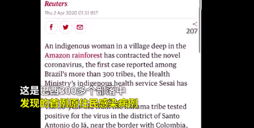 在南美洲的亞馬遜部落,已經發現至少16人感染新冠病毒,3人死亡。對於離群索居的亞馬遜部落來說,他們沒有抵禦外來疾病的免疫力、缺少必要的物資和醫護,一旦新冠在這裡蔓延,打擊將是致命的!