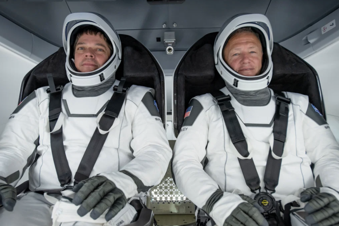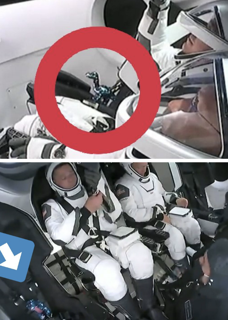 圖 | 鮑勃·本肯(左)和道格·赫爾利(右)(來源:SpaceX)執行此次飛行任務的是兩名資深宇航員鮑勃·本肯 (Bob Behnken)、道格·赫爾利 (Doug Hurley),兩人在過去都是開過航天飛機的人。在這個可以裝在 7 人的飛船里,顯得空間非常寬敞。圖 | 宇航員 3 號——小恐龍安全帶已綁好,飛行準備就緒!
