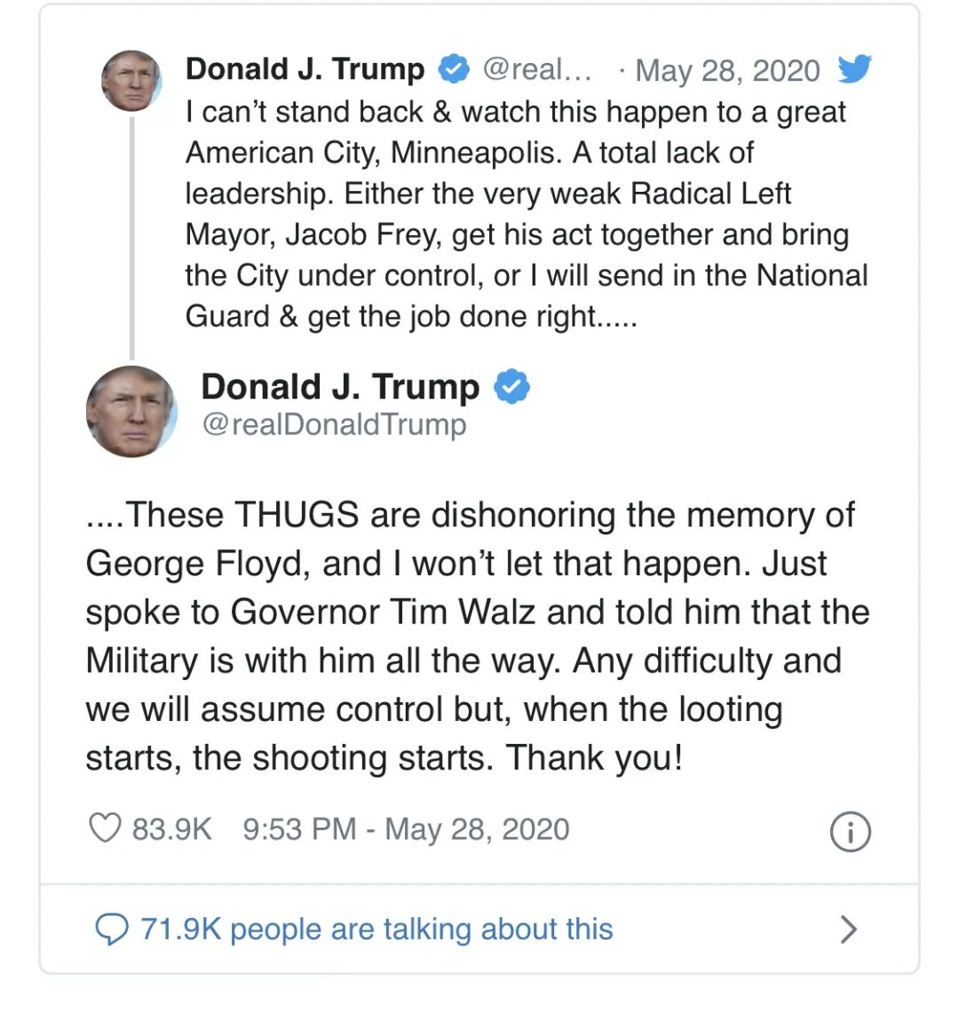 2020年5月25日,新冠疫情期间平常的一个周一。 清早的纽约中央公园,一名叫Amy Cooper的白人女性在人跡稀少的Ramble区遛狗。Amy是一家投资公司的中层,被一名也在同一区域观鸟的黑人男子Christian Cooper(同姓,没有亲属关系)要求系上宠物狗的牵引带。 Ramble区域本来就要求所有狗都系上牵引带(on-leash),但是Amy拒绝了,表示自家的狗不会乱跑。 Christian多年来热爱观鸟,也遇到过许多拒绝拴狗的顽固主人,于是他从口袋里掏出狗食逗狗。大多数的狗主人遇到这样的情况都会乖乖地拴上狗离去,Amy Cooper愤怒了, 向Christian发出严正的警告,威胁电话报警。 Christian是一名哈佛大学的毕业生,在纽约工作生活多年,面对愈发激动的Amy,他掏出了手机,录下了以下的一幕。 画面中Amy站在远处拨打了911,以极其惶恐的语气向报警电话接线员表示“我正在中央公园,有一名非裔美国人正在要威胁我的性命!” 没有任何人要威胁Amy的性命,而Amy手中的狗,颈链被死死拽着,不断地跳跃挣扎让人非常不适。它的性命才被威胁了。 拨打报警电话的Amy很明白她手中白人的特权(the power of whiteness)。作为一名美国黑人,最大的恐惧大概就是被指控犯罪,会被警察如何处置。一个情绪激动被害者形象的白人女性 vs. 黑人男性,警察到底会相信谁的故事版本。 Christian用手机记录了整个报警电话的过程。随后两人分别离开了案发地,视频被发布在了社交网络上。短短的一天内,Amy被公司解雇,她的狗被领养机构收回,整个美国沸腾了。 这仅仅是美国白人对黑人过激报警的情况的一个缩影,只是恰好被完美地记录了下来。类似的事件层出不穷,2018年两个黑人男子(Rashon Nelson,Donte Robinson)在星巴克等朋友,莫名其妙被白人店员报警后逮捕;不久后奥克兰一名白人女性打电话报警在公园里烧烤的一家人(黑人),该家庭随后被警察扣留询话了一小时(BBQ Becky)。 然而有些人的过激反应并不是报警,而是掏出了他们的枪。 就在几个月前,2020年2月23日,25岁的Ahmaud Arbery在乔治亚州Brunswick跑步锻炼,被一对开着皮卡的白人父子(Gregory McMichael ,Travis McMichael)追击。Ahmaud身上没有任何武器,也没有犯任何罪,就这样被冷血地杀害了。跟随其后的另一位目击者用手机录下了全程。 案件发生后,本地检察局并没有下令马上逮捕McMichael父子,事件一直拖到了5月初,一名本地律师在网上发布了视频后引发了社会的强烈关注,McMichael父子在5月21日才被收监,也就是在Amy Cooper打电话“假”报警的第二天。公平与正义缺失了足足74天。 5天以后,一名叫George Floyd的男子在明尼阿波利斯市区,被怀疑使用了一张20美元的假钞——警员用膝盖抵住他的后颈,把他按在了地上足足8分53秒。视频画面中,他哀求警员别杀害自己,自己无法呼吸。路人向警员建议放手,此时George已经失去了知觉,却被另外几名警员强行推开。即便在Gregory没有心跳后,依然被死死按在了地上。 George的死激发了美国全国大规模的游行,很多人走上街头为他声张正义,四天后,为首的警员Derek Chauvin被收监,另三名参与的警员被当即解雇。 Gregory Floyd不是第一个死在警察暴力执法下的美国黑人,也不会是最后一个,这是最让人难受的。 有千千万个Christian、Gregory、Ahmaud的故事发生在美国大城小镇,只不过他们的事故全程并没有被手机视频记录下来。 通常我们说的Racial Profiling (种族归纳)是最根深蒂固的机构性歧视的一种,是执法机关以种族肤色国籍或者宗教信仰来识别个人以及判定一个人是否有犯罪嫌疑。 #BlackLivesMatter的起因就是反对警察的暴力执法、过度执法、以及系统性歧视(Institutional racism)—— 对一个族裔的刻板印象长期固化,不知不觉中上升为权力机关的体制性歧视,是非常可怕的。把不服从命令的亚裔拖下飞机,把看起来像非法移民的墨西哥裔铐上警车、向不服从的黑人直接开枪一样,成为了美国暴力机关的下意识行为。 虽然大多数为Floyd声张正义的游行都是和平进行的,一部分依然转化成了暴力的打砸抢(riots)。这也不是第一次,一场本来和平的聚集突然被带歪。美国总统川普立刻发推警告”谁敢抢,开枪伺候”(When the looting starts, The shooting starts),并谴责参与打砸抢“暴徒”(thugs),要求国家警卫队进驻维持秩序。 然而在很多中文营销号的笔下,所有的背景信息似乎全被抹去了。“黑人打砸抢”、“美国水深火热”成了他们点击率的狂欢。 ● 他们完全无视绝大多数的游行都是和平进行的。 ● 他们并没有告诉你,接连恶化的重大公众事件让Gregory Floyd一案只是压跨骆驼的最后一根稻草。 ● 这也是美国司法系统对黑人的系统性歧视长期得不到解决,和平示威得不到任何重视的结果。 ●砸抢的大多数参与者发泄私愤或有其他企图,与为Gregory Floyd寻求公正、反对暴力执法、系统性歧视的诉求基本无关。 …… 历史在重演 这样的伎俩我们见多了,从当年”伯克利骚乱”到“114美国大骚乱”,恐慌带来的点击量鼓了营销号们的钱包,又应景了中文圈对黑人本来就存在的歧视和偏见。 明尼苏达的政府官员表示,估计80%参与暴力骚乱的参与者并非是明尼阿波利斯的的市民,他们的其中不乏来自左右极端组织的成员,参与骚乱的也不乏黑人以外的其他各个种族。 5月31日,川普发推宣布Antifa为国内恐怖组织。 先不论川普是否已有任何确凿的证据整场骚乱完全都是由Antifa造成的,或者他是否