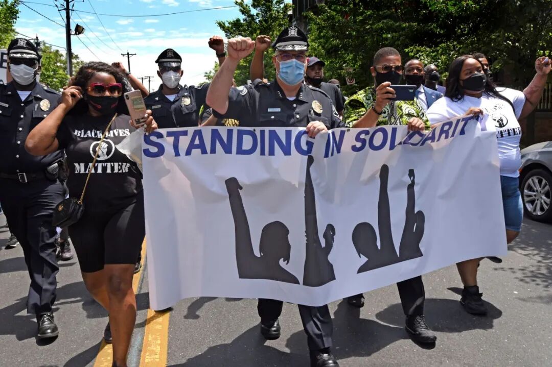 即使如此,這次一些警察做出的這個單膝跪地的姿勢在美國警民衝突的漫長歷史上不僅非常罕見而且意義非凡。他們不是在求饒,而是在跟示威者一起抗爭,這個姿勢傳遞出的信息是:你的苦我明白,我和你一樣對警察的執法暴力不能接受,我們不是敵人,種族歧視是我們共同的敵人。這一點在新澤西州Camden市周六的一場示威中更加直觀地體現出來:當地警察在局長的帶領下加入示威者的隊伍,和他們一起拉開條幅,上書:“站在一起”(standing in solidarity)。