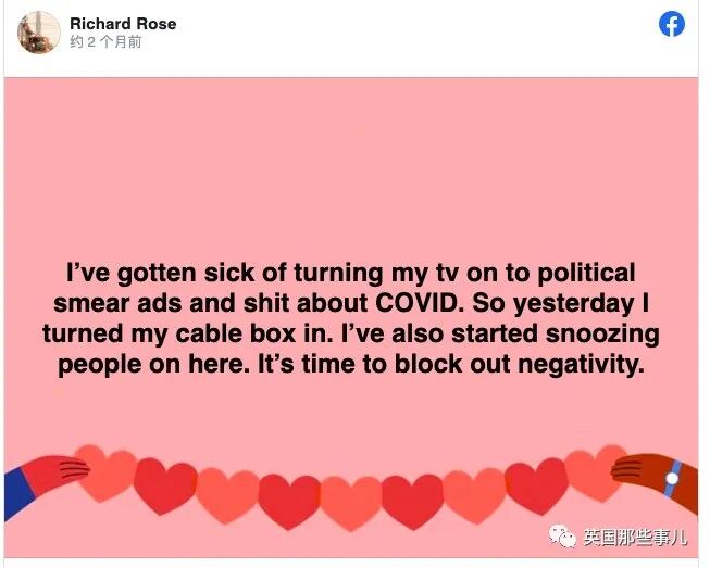 “真受不了一打開電視就是政治抹黑廣告和各種新冠的狗屁,昨天把機頂盒還了,臉書我也要開始清人了,不想再看任何負面了。”