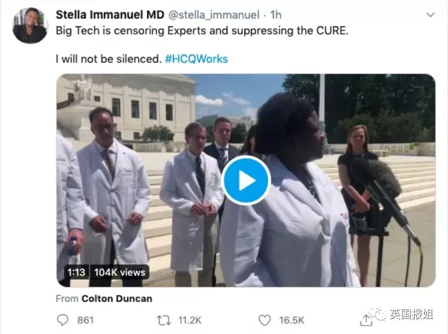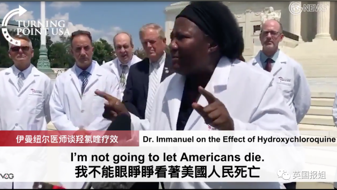 这周一,一个美国右翼媒体发表了一则视频。视频中一群穿着白大褂,自称是来自“美国前线医生”组织的医务工作者们,在华盛顿最高法院门口慷慨激昂的演讲。