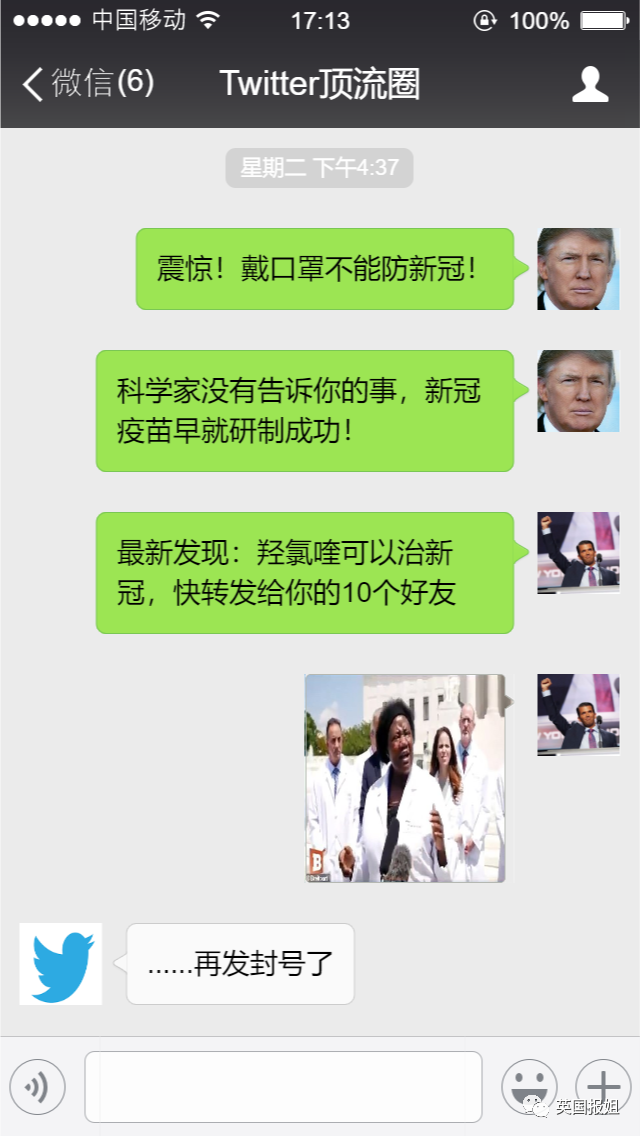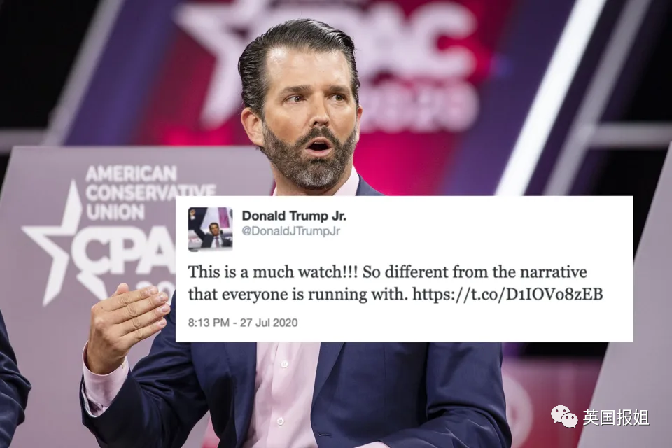 几个小时后,意想不到的展开发生了。羟氯喹的忠实拥护者——川普和他的大儿子小唐纳德,激情转发了这个视频,小唐纳德还激动地告诉粉丝们:“这视频你们必须看看!”