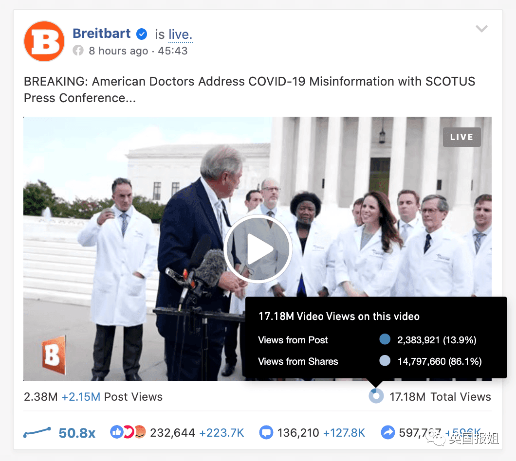 川普这人流量多大啊,8400多万粉丝呢。视频刚经过这两位的手,就立马得到了各路人气账号的支持转发。当然,这些人大部分来自极右组织、反疫苗组织、阴谋论团体,导致这则视频获得了千万级的浏览量,真的信了,转发的人更是不少,其中就包括很多共和党人。