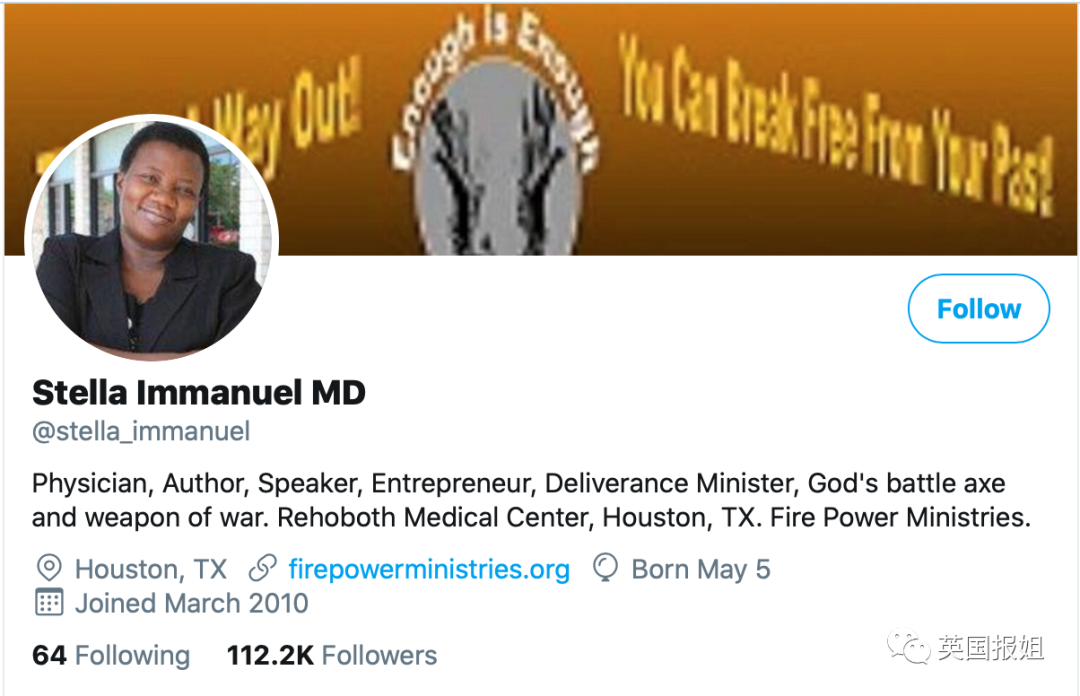 根据纽约时报的报道,这个医生的名字叫Stella Immanuel。她并不是什么医学界大牛,和新冠防治工作也没啥关系。她出生在喀麦隆,医学院是在尼日利亚上的。