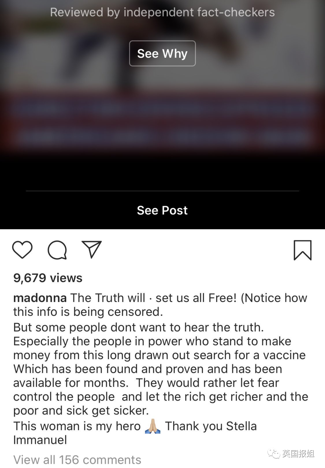 就连流行天后麦当娜都在ins上两次发布了这则视频,麦当娜虽然反川普,但却在阴谋论上和懂王不谋而合。她对她的1540万粉丝说:“有些人不想听到真相,真相才会让我们自由。”