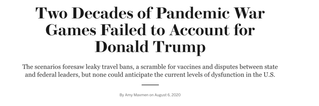 相關文章:Two Decades of Pandemic War Games Failed to Account for Donald Trump,  By Amy Maxmen on August 6, 2020