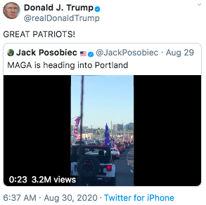 周六(8月29日),川普的支持者車隊和“黑人命也是命”(Black Lives Matter)的抗議者在俄勒岡州波特蘭街頭暴發衝突,致一人死亡。川普將車隊形容為“偉大的愛國者”,引發民主黨人譴責,總統和波特蘭市長展開了唇槍舌劍。與此同時,川普周二前往威斯康星州基諾沙的計劃,也遭到了州長市長的反對。