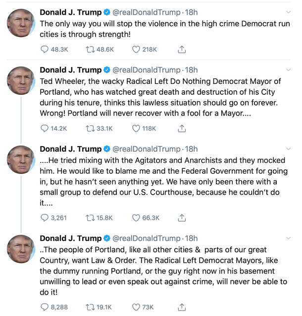 "激進的左翼民主黨市長們,比如管理波特蘭的那個白痴,也許現在躲在地下室里不願意領導,甚至不願意對犯罪發聲,這個傢伙將永遠無法做到這一點!"